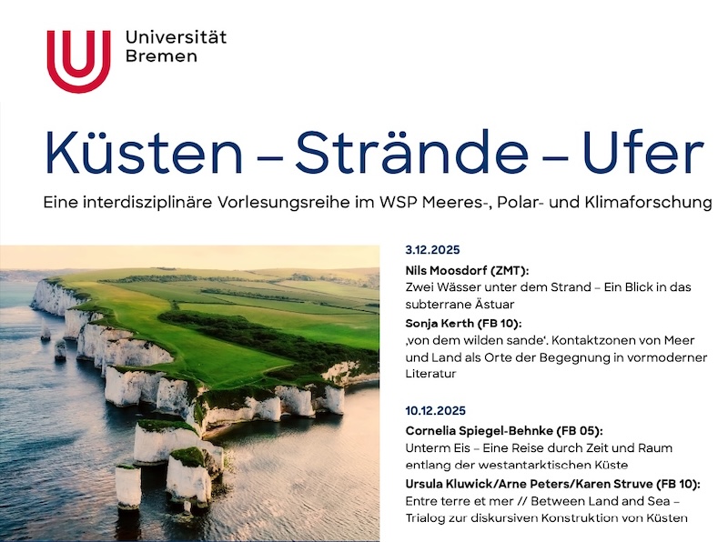 Diese Vorlesungsreihe betrachtet Aspekte von Küsten, Stränden und Ufern aus der Perspektive verschiedener Fachbereiche und ermöglicht so einen interdisziplinären Dialog. Was passiert, wenn unterschiedliche Kulturen, Menschen, Lebewesen, Elemente, Materialien und Kräfte in littoralen Räumen aufeinandertreffen?